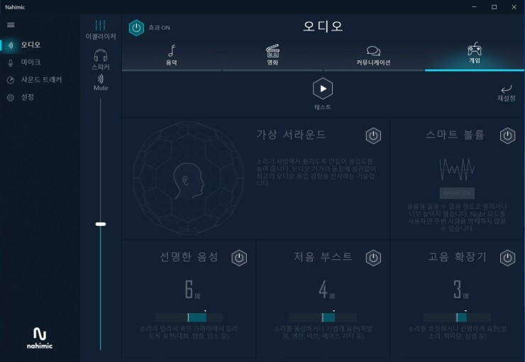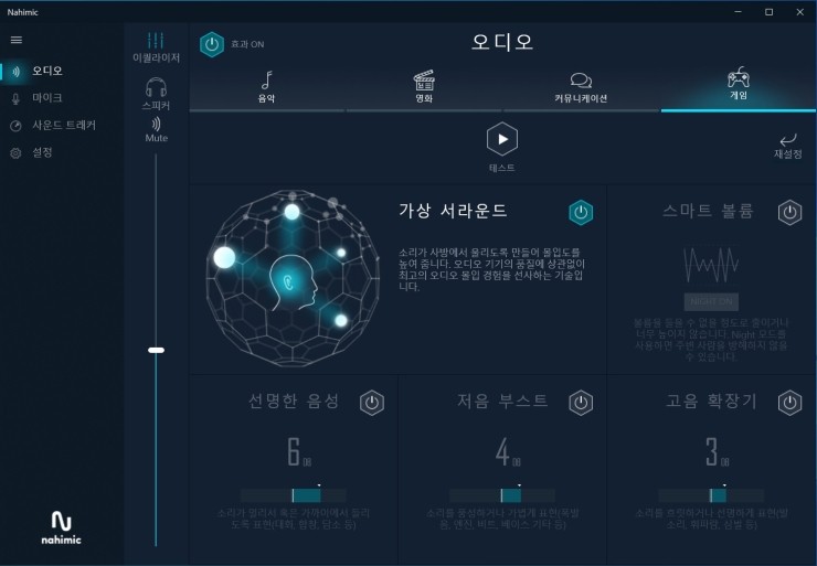 다른 옵션 다 끄고 가상 서라운드만 켜봤는데 큰 차이는 모르겠습니다. 하단의 선명한, 저음, 고음 을 전부 켜야 확연한 차이를 느낄 수 있네요. 암튼 결론은 사블 g1과 설정 방법이 거의 비슷한 거 같습니다.